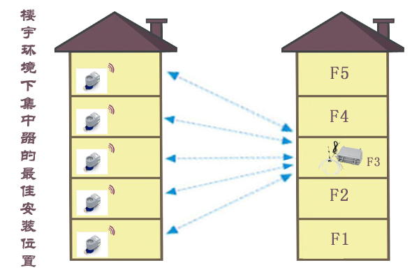 1、集中器安裝的位置要盡量避免與表具之間相對位置處于垂直方向,比如說,A棟樓共5層,裝有X只表,如果為了與A棟表通信,而在A棟樓頂裝集中器,通信效果遠不如安裝在對面樓3層位置。如下圖。